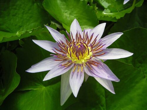 - Floración: perfumadas, solitarias, de color azul claro y aún más claro hacia el centro con estambres amarillos; sobresalen del agua, dispuestas sobre sus tallos, posee pétalos estrechos y puntiagudos, en forma de estrella. Es de floración diurna.