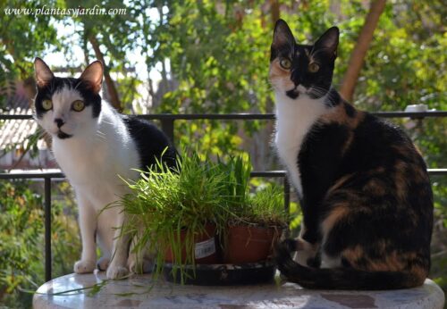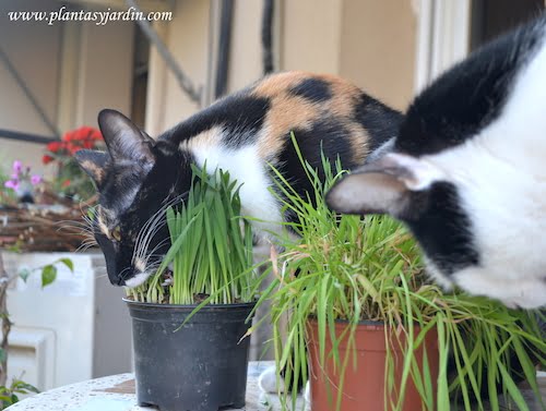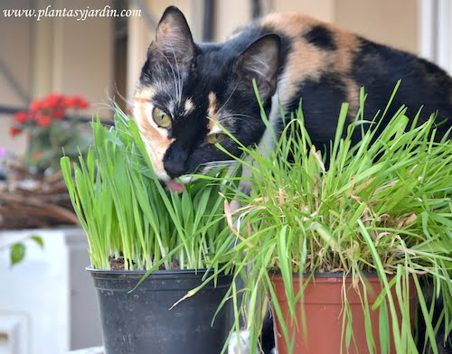 Una eficaz forma de evitar que nuestras mascotas coman de estas plantas que son tóxicas para ellos, es tenerles siempre a mano, la hierba para gatos, el kitty grass. En casa tenemos 2 hermosos gatitos, los modelos de las fotos, y mi experiencia es que mientras tengamos disponible estas atractivas hierbas, no irán a morder nuestras plantas ornamentales. Que bien llamadas están plantas ornamentales, no comestibles. Cada vez que abro la puerta corrediza del balcón, mis gatit@s lo primero que hacen es ir directamente a por las hierbas gatunas.