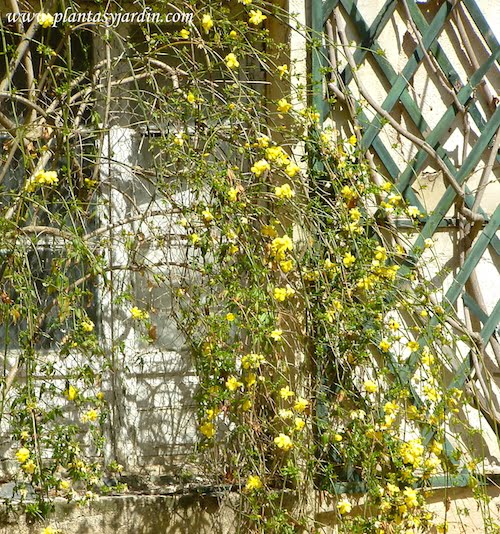 Fachada cubierta con treillage o celosía de madera y Jasminum nudiflorum, florecido sobre sus tallos desnudos