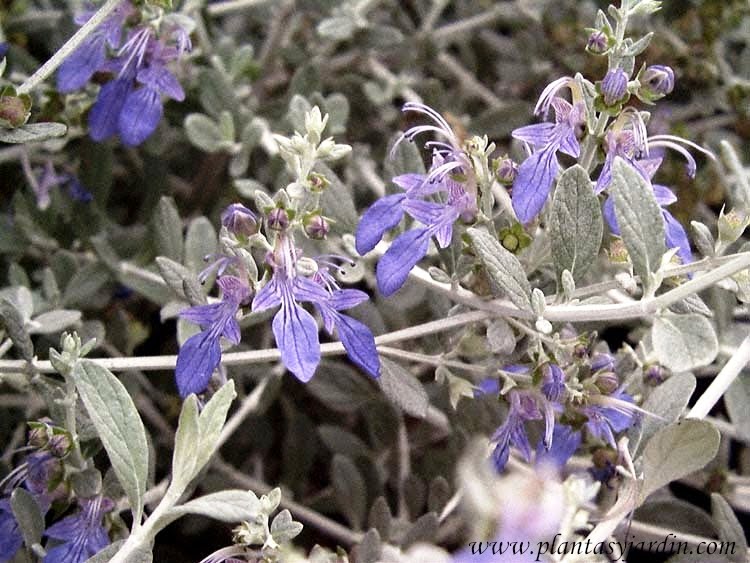 • Teucrium fruticans: hojas ovaladas, aromáticas, de color gris y pubescentes con el envés blanco. Floración: pequeñas flores de color azul, durante la primavera y el verano.
