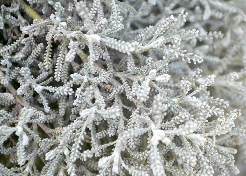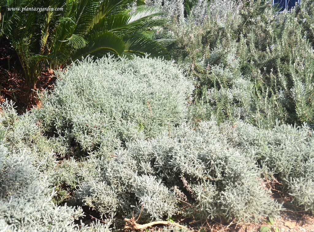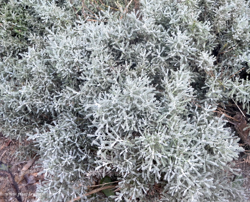 - Follaje: perenne. Los brotes están recubiertos con lana de color blanco. Hojas oblongas, estrechas, muy aromáticas y finamente recortadas como los dientes del peine. De color glauco.
