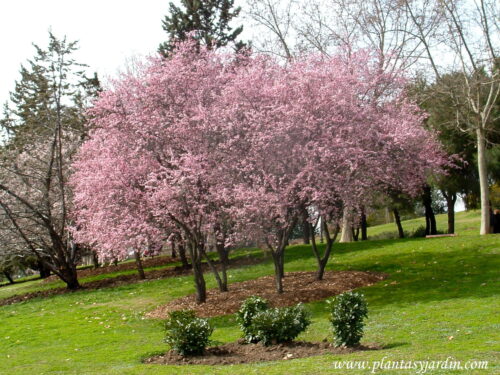 Es un árbol sumamente atractivo por la llamativa, abundante y espectácular floración de color rosado que produce en las primeras semanas de la primavera. Produce flores dobles y agrupadas, en vistosos racimos, en grupos péndulos de cinco. De color blanco o rosa, a comienzos de la primavera, cubriendo sus ramas desnudas. La floración dura alrededor de tres semanas.