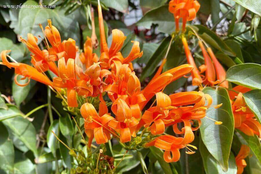 Pyrostegia venusta sinónimo de Pyrostegia ignea, conocida también como Bignonia de invierno, es una planta trepadora perenne. Produce una densa y abundante floración atrompetada de color naranja. Ideal para aportar color al jardín desde el otoño hasta la primavera.