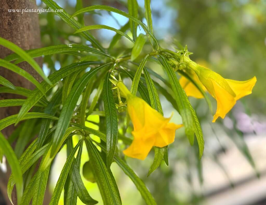 - Género: Thevetia, es un género compuesto por ocho especies de árboles y arbustos perennes, que se cultivan en jardinería por su atractiva y prolongada floración, desde el invierno hasta el verano inclusive. Está relacionado con el género Frangipani. Todas las especies del género producen savia venenosa y lechosa. Por lo tanto todas las partes de las plantas son muy tóxicas. Son parientes del género botánico Nerium, siendo su especie más conocida la Adelfa o Laurel del jardín,